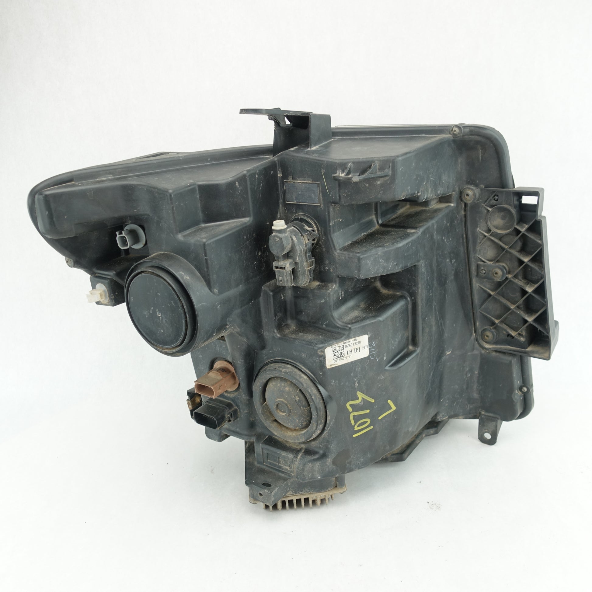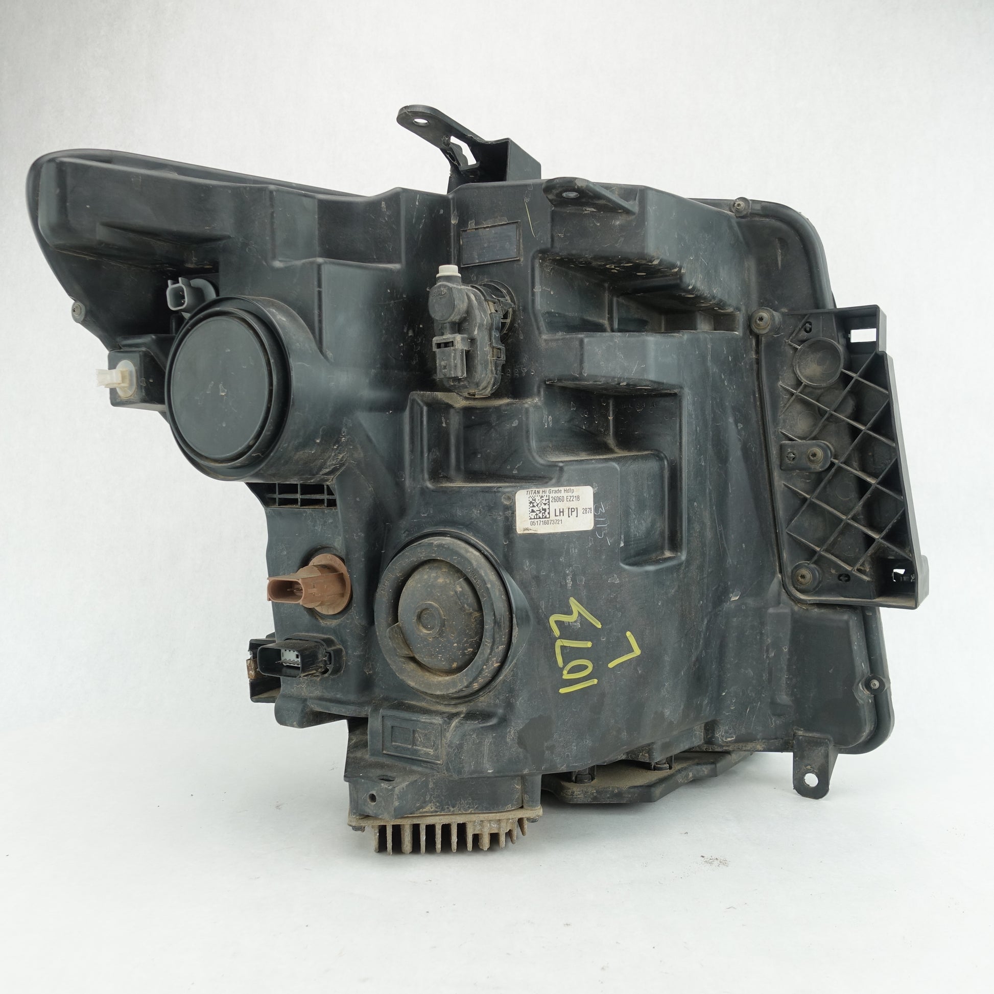 This is a used headlight from a 2016 Nissan Titan XD. The lens is faded on the top edge. Some small cracks in the mounting points. If you have any questions please ask.