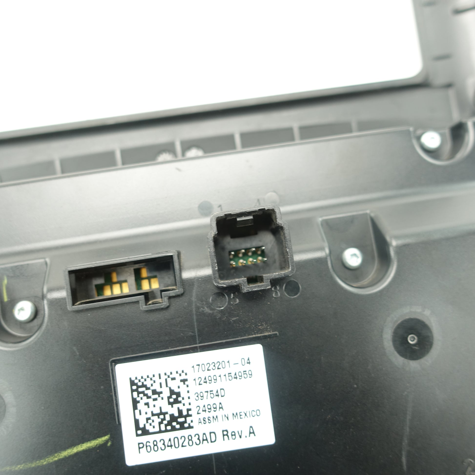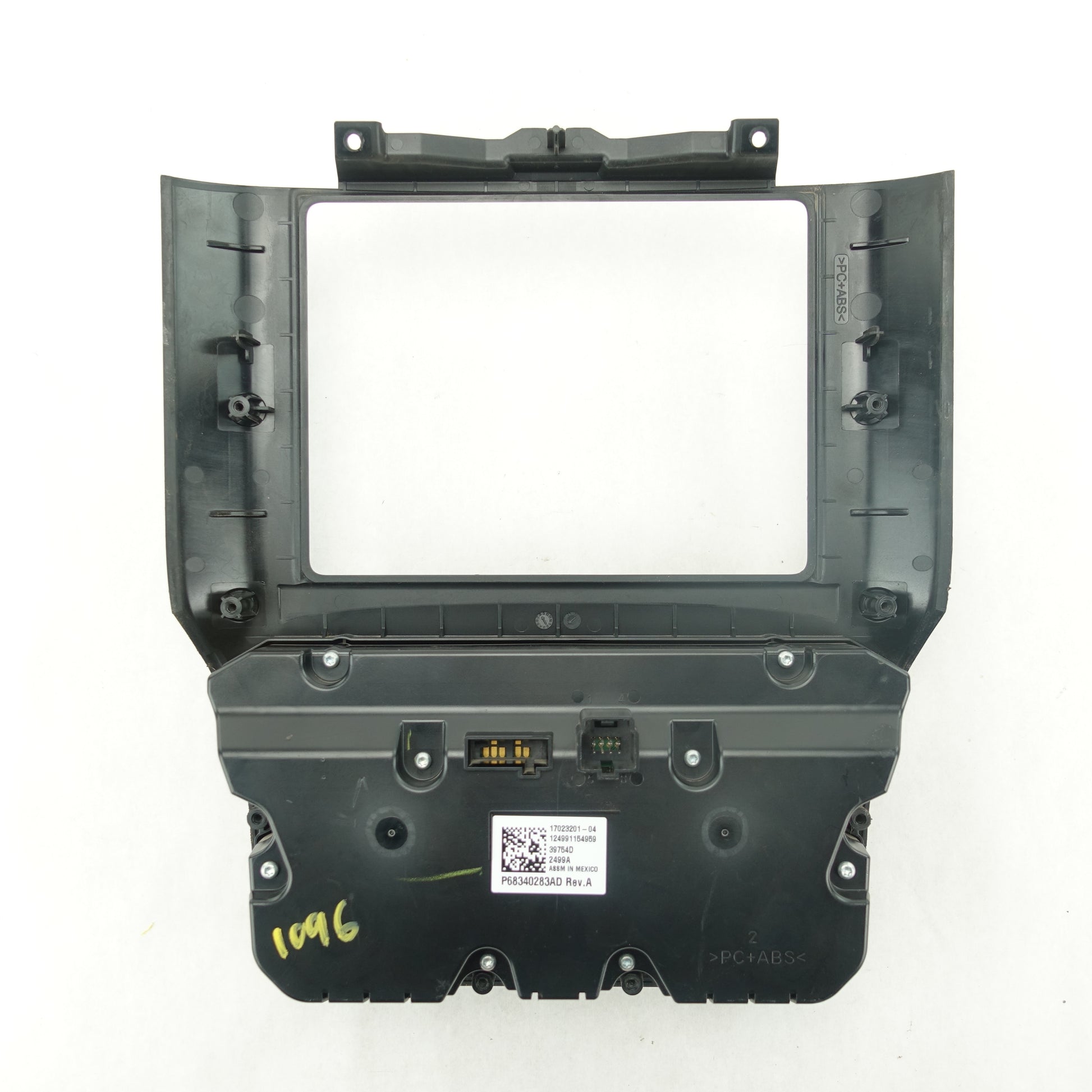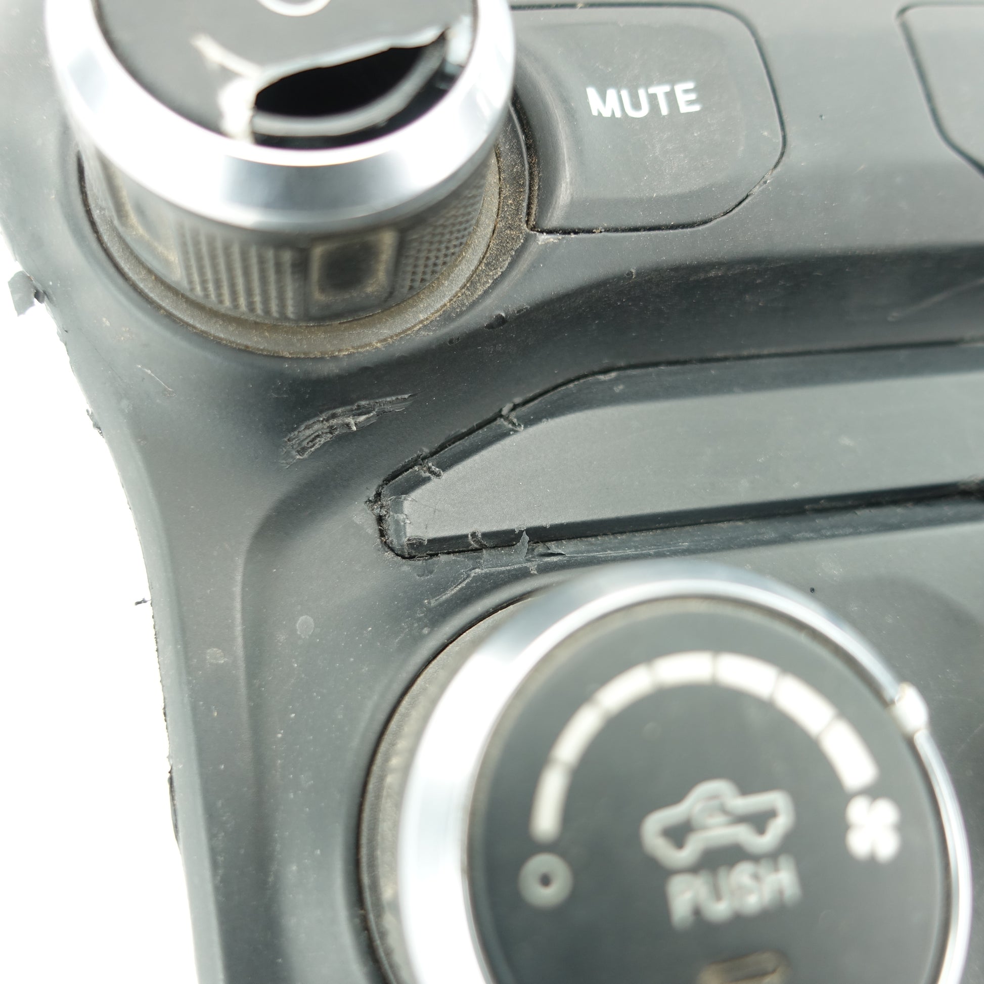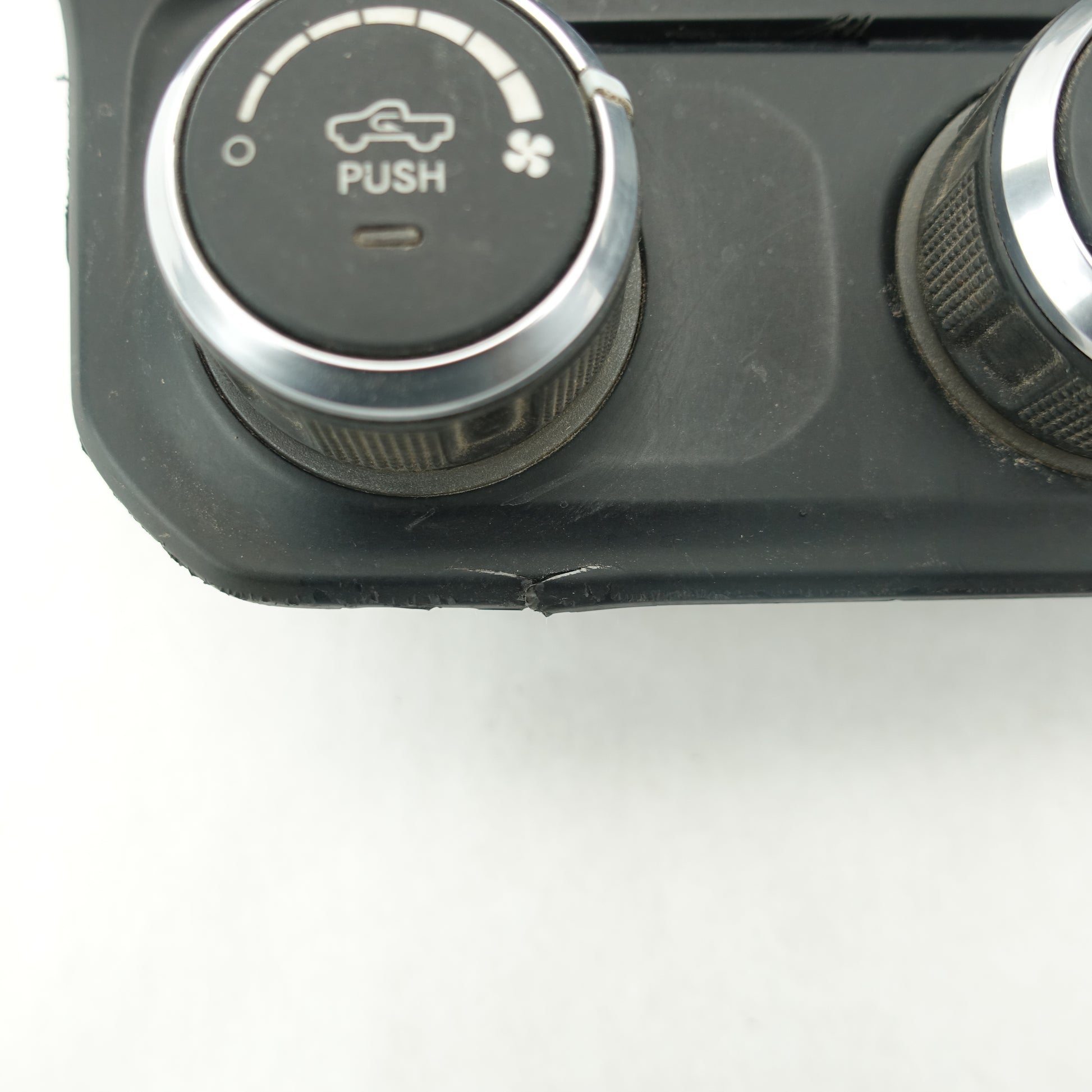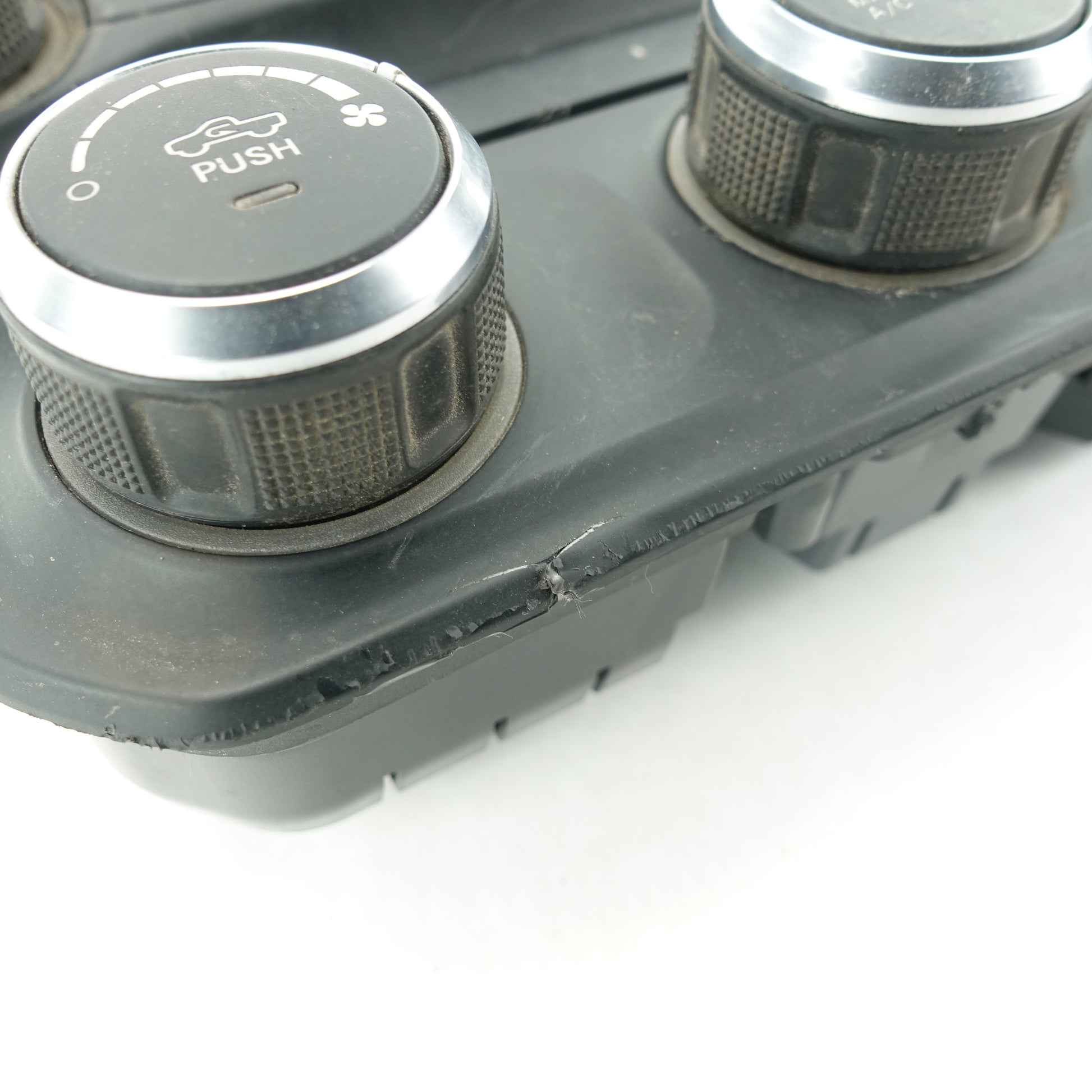 This is a used climate control from a 2019 Ram 3500. The power button is damaged. There are some scratches on the face of the item.